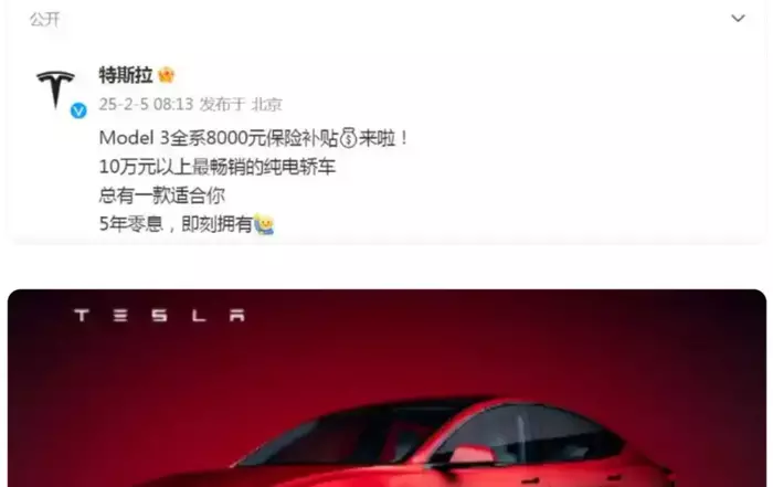 就在同一天,特斯拉也宣布,从2月5日起至2月28日Model 3全系限时保险补贴8000元,补贴后22.75万元起售,同时可享购车5年0息政策及特享充电权益。这一可被视为“直降8000元”的购车政策是特斯拉保险补贴首次覆盖Model 3全系车型,亦为“保险补贴”与“5年0息政策”首次同时推出。和小鹏有不同又有所相同,相同的是5年0息,不同的是相比小鹏少了0首付。