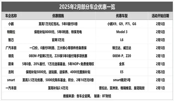 BT财经梳理发现,自2月以来,除小鹏、特斯拉和广汽丰田之外,蔚来、吉利、领克、一汽丰田等近10家车企也加入了新年促销大战,纷纷推出新春购车礼。