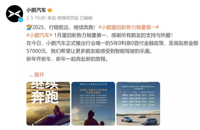 小鹏在官微宣布正式推出5年0息0首付金融政策,至高贴息金额57000元,并强调是行业唯一。同时小鹏还强调1月小鹏销量重回新势力第一。小鹏也打破了理想长期霸榜新势力销量第一的局面。