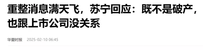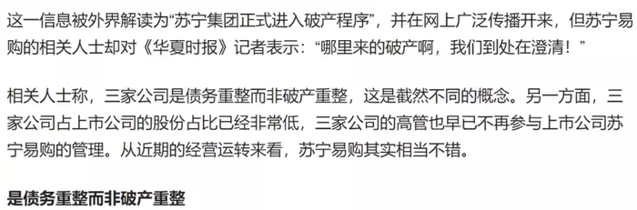 据《华夏时报》报道,苏宁正式回应“破产”传闻,称既不是破产也跟上市公司没关系。据报道,苏宁方面称“三家‘破产’传闻公司持股苏宁易购的比例非常低,三家公司的高管早不参与上市公司的管理,同时三家公司为债务重整而非破产重整。”
