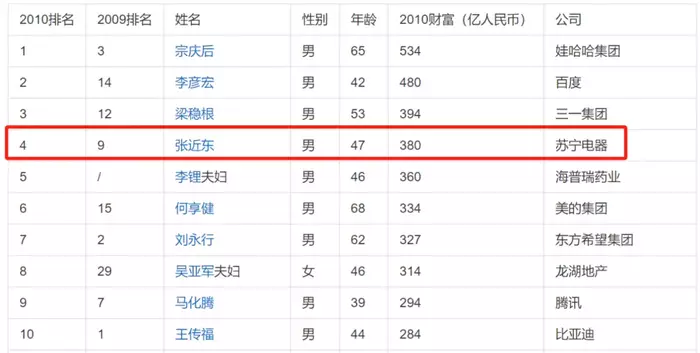 2011年,上市公司苏宁易购的扣非净利润达到历史最高的46亿元,是国美的两倍多,在业务规模、门店数量上也全方位碾压了国美。张近东也在2010年高居中国富豪榜第四位,马化腾、王传福的财富都和他有近百亿的差距。