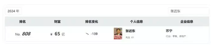 《2024胡润全球富豪榜》显示张近东财富为80亿元,排名第2895位,比2023年下滑了1010名。2020年张近东的财富为1020亿元,全球排名102位。四年时间,张近东的财富蒸发了940亿元。最新的中国富豪榜前一百位已经找不到张近东的名字。此时张近东的财富进一步缩水至65亿元。