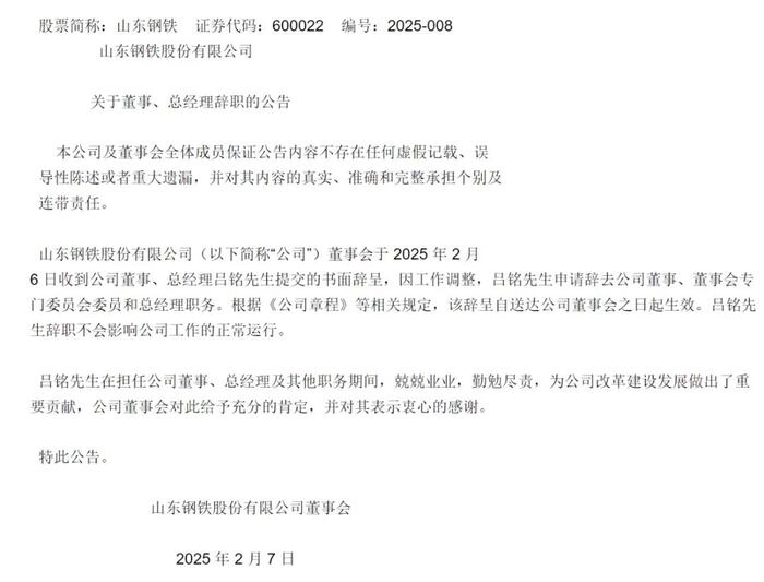 2月7日,山东钢铁发布公告称公司董事、总经理吕铭辞职,这距离山东钢铁发布2024年业绩预告不足20天。1月18日山东钢铁在业绩预告中称全年最高预亏24亿元。而吕铭被聘任为山东钢铁总经理是在2024年7月,从上任到离任只有7个月。