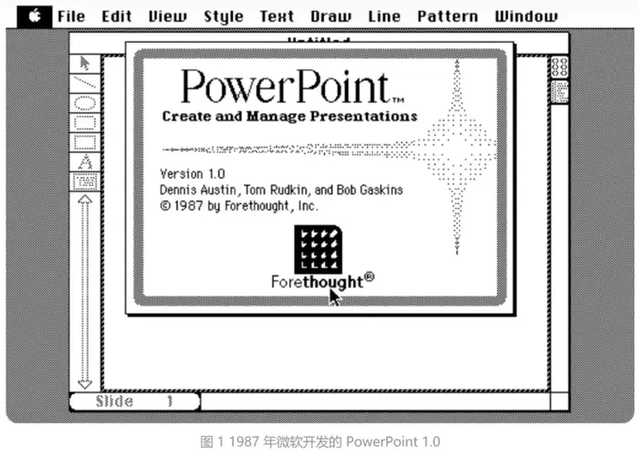 PPT并不是微软这样的大公司开发出来的,而是由一家名为Forethought的小型软件公司开发的,这家由两名前苹果员工创立的小公司,看到了Macintosh电脑具有图形界面的优势,想要开发一款能够利用这一特点的演示软件。