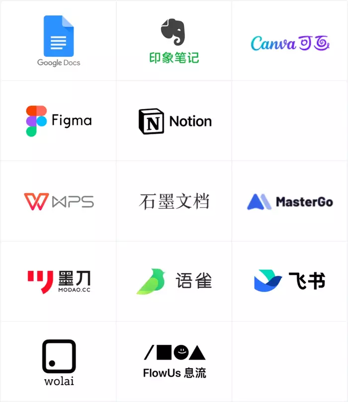 国外相关产品很多,而国内也上线了很多新产品,WPS、石墨文档、MasterGo、墨刀、语雀文档、飞书文档……等等。