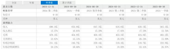 财报显示,微软2024年第二季报营收696.3亿美元,同比增长12.27%。营收增幅看似不错,但却是近6个季度营收增长新低。此前5个季度的营收增幅分别为16.04%、15.20%、17.03%、17.58%和12.76%。同期归母净利润为241.1亿美元,同比增长10.23%,此前5个季度净利润增幅分别为10.66%、9.74%、19.89%、33.15%和26.97%,净利润增幅仅高于2023年四季度。