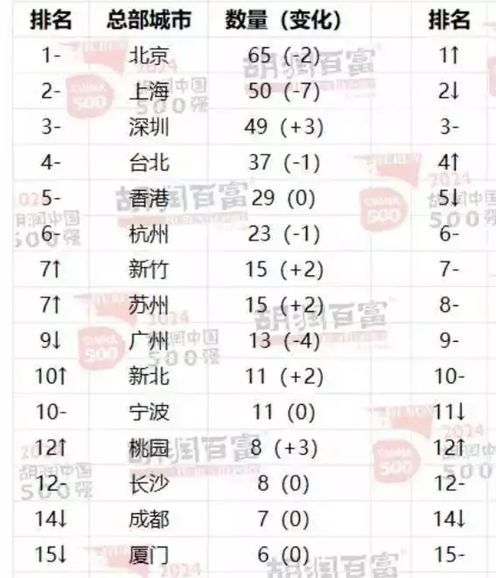 2月25日,2024胡润中国500强企业出炉。按照城市分布来看,北京依然稳居榜首,共有65家入围“胡润中国500强”。上海以50家的数量保持第二位,深圳则以49家的数量紧随其后,位列第三。台北37家,香港29家,杭州23家,前六大城市占总数的50%。从数量看,深圳比杭州多了一倍以上。
