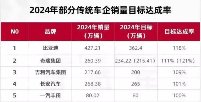 2024年,长城汽车销售新车123.3万辆。据长城汽车2023年限制性股票激励计划(草案),2024年其销售目标为190万辆,因此实际完成率仅为64.91%。而传统车企中奇瑞、吉利以及已经完成转型的比亚迪,都在2024年超额完成了目标任务。其中比亚迪目标完成率为118%、奇瑞为111%、吉利为110%,长安为101%……长城不到65%的目标完成率在一众车企中略显有点“格格不入”。