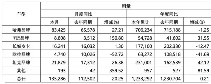 具体到长城的销量分布上,新能源车型销售32.1万辆,同比增长22.82%。哈弗依然是长城汽车的销量担当,2024年一共卖出70.6万辆新车,但同比却出现1.25%的下滑。定位于科技高端的魏牌,也在2024年依靠智能化实现逆袭,累计销量5.4万辆,同比增长31.55%;坦克SUV持续在越野领域发力,2024年累计销售23.1万辆,同比增长42.12%;长城皮卡全年销售17.7万辆,同比下滑12.47%。欧拉品牌全年销售6.3万辆,同比下滑了41.69%,成为长城众多车型中下滑较多的一款。