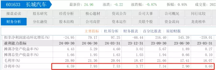 2024年前三季度,长城的毛利率和净利率持续走高。2024年三季报显示,长城毛利率20.76%,相比上一年同期的18.84%提升1.92个百分点。7.33%的净利率更是同比提升了3.15个百分点。具体到季度,前三季度的净利率分别为7.53%、7.93%和6.59%,而上一年同期分别为0.60%、2.90%和7.34%。可见长城的“弃量保利”或达到了预期效果。