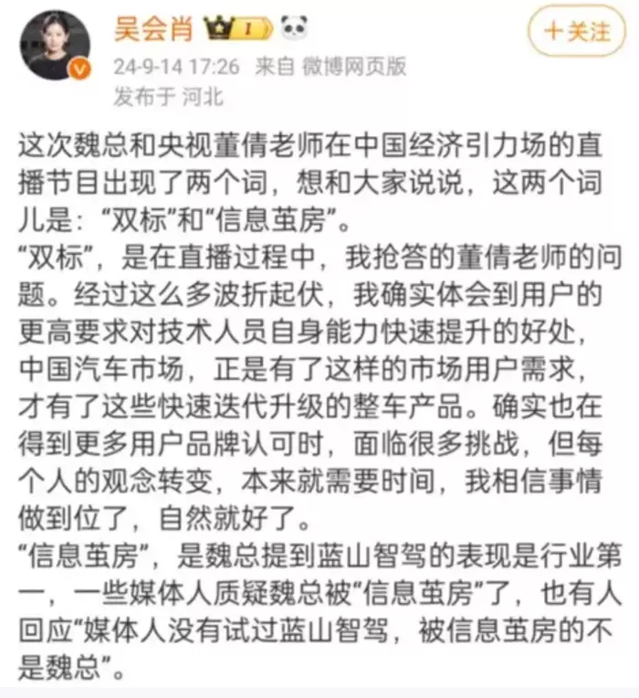但很快长城智能化副总裁吴会肖出来“澄清”,表示魏建军没有被“信息茧房”。吴会肖在微博中再三强调了“双标”和“信息茧房”两个词,虽然没有直接否认董事长魏建军的言论,但从吴会肖发文中,或表现出并不太认可“长城智驾NO.1”的说法。