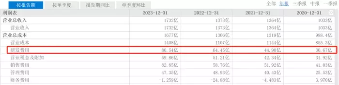智驾的研发极为烧钱,这是行业公认的事。长城也确实在研发上投入巨大。财报显示,2020年至2023年,长城研发费用分别为30.67亿元、44.90亿元、64.45亿元和80.54亿元,同比增长12.93%、46.36%、43.56%和24.97%。2024年前三季度,长城研发费用为61.98亿元,同比增长12.67%。长城研发费用的增幅已经由2021年和2022年的45%左右逐步下滑至2024年前三季度的12.67%。