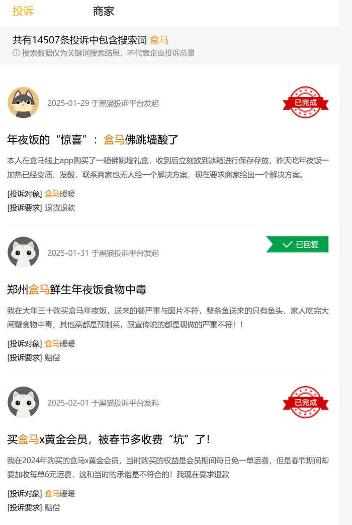 春节期间,盒马年夜饭成为重灾区:佛跳墙变质发酸、八宝鸭内藏塑料片、预制菜导致食物中毒... 黑猫投诉平台上,超 300 条投诉指向 "盒马春节套餐",部分消费者晒出医院诊断证明,控诉 "吃完年夜饭全家进急诊"。