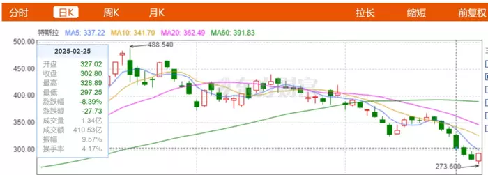 在从宣布FSD进入中国市场后,特斯拉股价遭遇连跌,其中2月25日单日股价跌幅达8.39%。截至2月28日收盘,特斯拉股价跌幅达25%。特斯拉市值再度跌破万亿美元,截至28日,特斯拉市值为9424亿美元。较2024年12月18日的高点蒸发了6291亿美元,马斯克的个人财富也随之缩水超千亿美元。