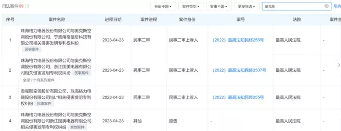 天眼查数据显示,截至2025年2月,奥克斯与格力的诉讼纠纷多达89起,其中绝大多数都是和专利侵权有关。比如2015年和2017年,格力两次将奥克斯告上法庭,指控其侵犯专利。这两次格力均赢得了官司,其中2015年获赔230万元,2017年获赔4000万元,创下空调行业专利索赔的最高纪录。