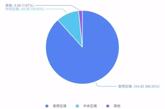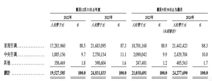 虽然奥克斯的全称是奥克斯电气有限公司,但目前奥克斯营收较为单一。2024年前三季度,家用空调营收214.4亿元,中央空调营收24.3亿元,两者合计营收238.7亿元,占总营收242.78亿元的98.3%,报告期内空调业务营收占比均在98%以上。这其中家用空调为其主要营收来源,2024年前三季度家用空调业务占总营收的88.32%。