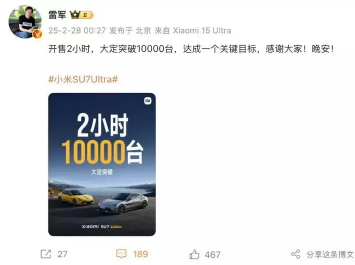在小米SU7 Ultra上市第二天,雷军在凌晨0点27分于社交平台发文称“达成关键目标”,此前雷军曾表示小米SU7 Ultra团队原计划全年销量目标为1万辆,而如今小米仅用时3天就完成全年目标,远超雷军预期,更是让整个车圈震动。