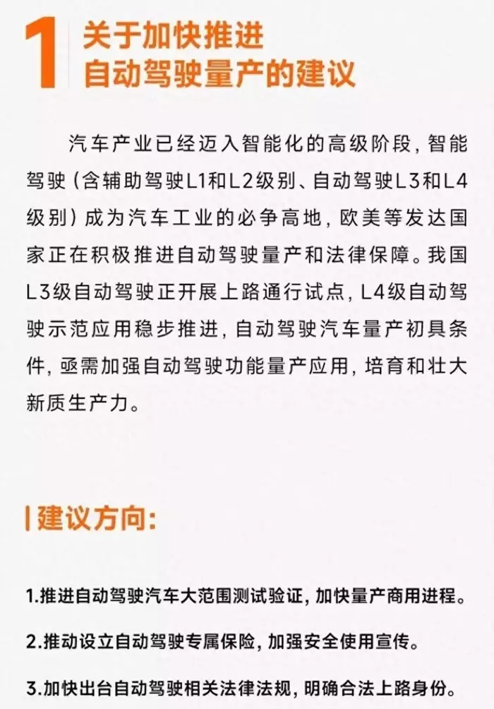 显然雷军做足了功课,每项提案也给出了具体建议方向,包括推进自动驾驶汽车大范围测试验证,加快量产商用进程;推进充电设施互联互通,鼓励车企开放智能生态;健全人工智能终端标准体系;重启号牌式样调研论证,拓展号牌智能化功能;加快关于“AI换脸拟声”治理的单行法立法进程,切实治理“AI换脸拟声”,压实平台责任。