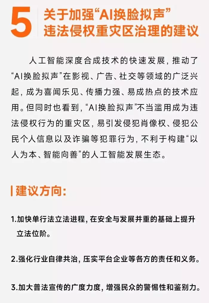 雷军的提案之一写道:人工智能深度合成技术的快速发展,推动了“AI换脸拟声”在影视、广告、社交等领域的广泛兴起,成为喜闻乐见、传播力强、易成热点的技术应用。但同时也看到,“AI换脸拟声”不当滥用成为违法侵权行为的重灾区,易引发侵犯肖像权、侵犯公民个人信息以及诈骗等犯罪行为,不利于构建“以人为本、智能向善”的人工智能发展生态。