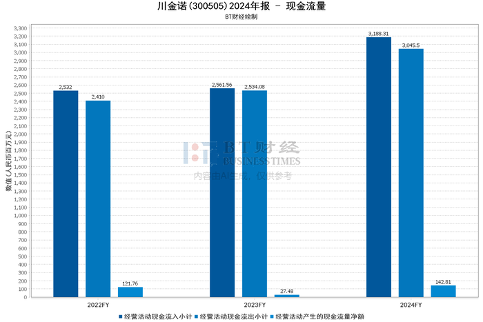 现金流量数据显示,2024年经营活动现金流入31.88亿元,同比增长24.47%,经营活动产生的现金流量净额1.43亿元,同比增长419.67%,主要因商品销售取得的现金流量增加,反映公司经营活动创现能力增强。投资活动现金流出4.91亿元,同比增长43.95%;筹资活动现金流出6.58亿元,同比减少27.59%。