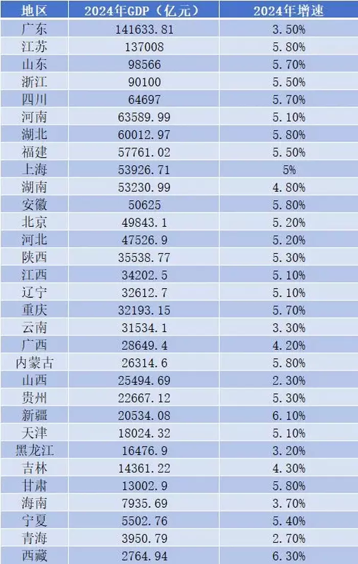今年两会上总书记提出:“圆满实现‘十四五’发展目标,经济大省要挑大梁。”据《中国经济周刊》报道显示,以2024年GDP情况来看,广东、江苏、山东、浙江、四川、河南的GDP总量位居前六,分别为14.2万亿元、13.7万亿元、9.8万亿元、9万亿元、6.5万亿元和6.4万亿元,六省的GDP总量达59.5万亿元,占全国总GDP134.9万亿元的45%。