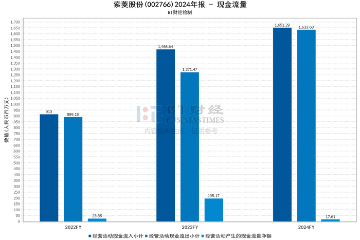 现金流量数据方面,2024年经营活动现金流入小计为16.51亿元,同比增长12.59%;投资活动现金流入小计为16.25亿元,同比增长121.52%;筹资活动现金流入小计为14.83百万元,同比下降53.24%。经营活动产生的现金流量净额为17.61百万元,同比下降90.98%,主要是由于去年同期收取的预收款较多,本年度冲抵相应应收款。现金及现金等价物净增加额为 - 95.06百万元。