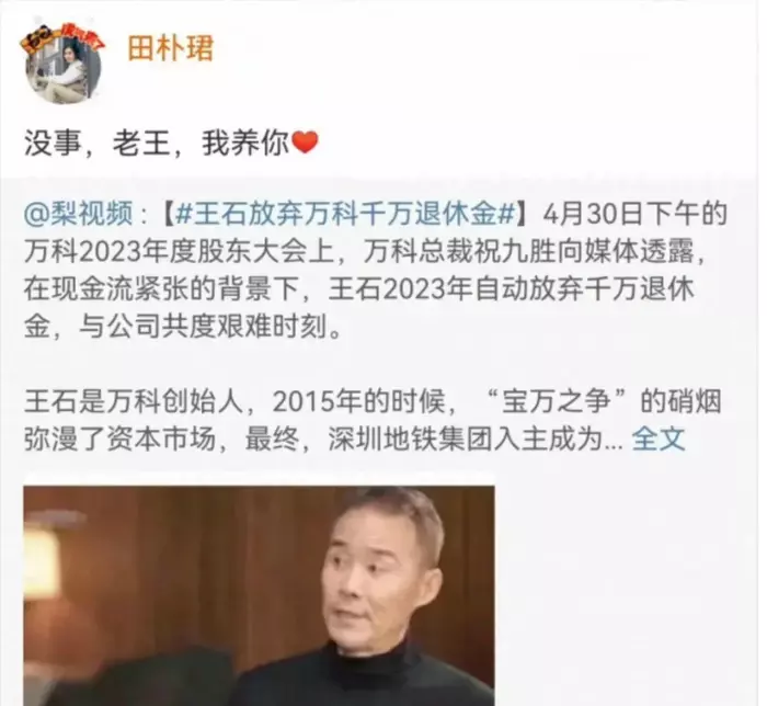 田朴珺在社交媒体上发文称“没事,老王,我养你。”此前王石在一档节目中称田朴珺的现金存款比他多。