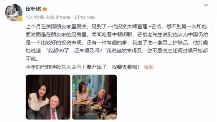 和王石结婚后,田朴珺的朋友圈完全脱胎换骨,除了褚时健这样的传奇大佬,还有世界投资巨头芒格,田朴珺也不止一次晒出和芒格的合影,在巴菲特股东大会前夕,在一个朋友家里见到了芒格,不出意外的也晒出了合影。在99岁的芒格去世后,田朴珺还发了颇为动情的小短文。