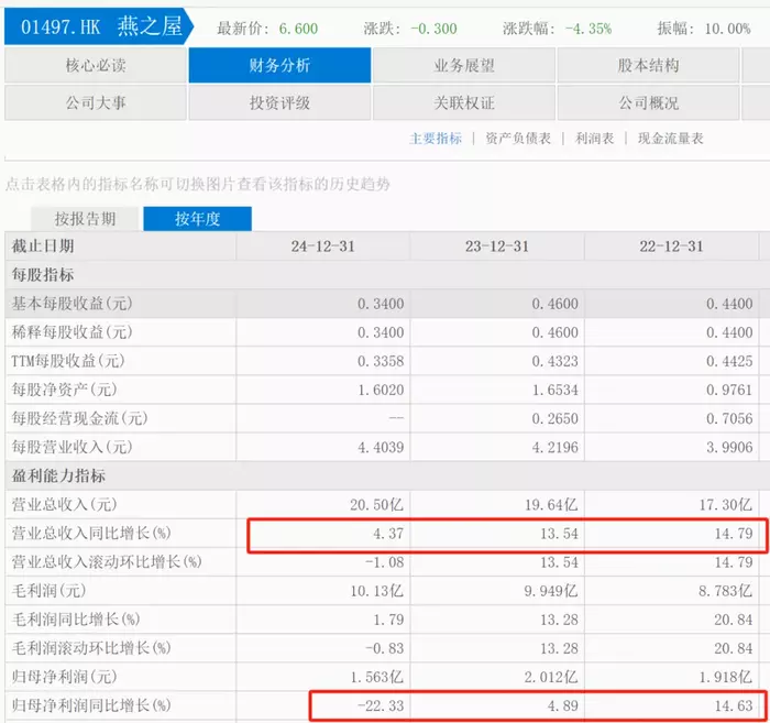 王石代言的这些品牌,真的收到成效了吗?目前来看尚不明朗。8848手机暂且不说,就以最新代言的燕之屋为例,最新财报显示,2024年,燕之屋营收20.50亿元,同比增长4.37%,是近三年来的增幅首次个位数,且近三年的增幅呈逐步下滑趋势,2022年和2023年营收增幅为14.79%和13.54%。与之对应的是净利润,2022年至2024年分别为1.918亿元、2.012亿元和1.563亿元,2024年净利润大幅下滑22.33%,此前两年增幅分别为14.63%和4.89%,下滑趋势更加明显。
