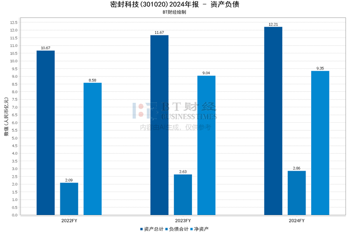 2024年,密封科技的资产总额达到12.21亿元,同比增长4.64%。归属于上市公司股东的净资产为9.35亿元,同比增长3.43%。资产负债率略有上升,从2023年的22.53%上升至2024年的23.43%。这种稳健的资产增长反映了公司在市场拓展和成本控制方面的有效策略。