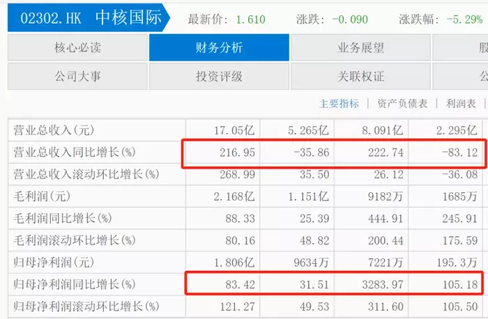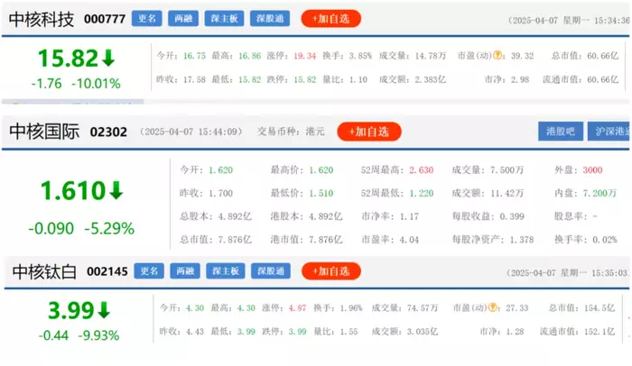 4月7日收盘,三大核心子公司股价均大跌,中核国际股价跌幅5.29%,最新市值7.876亿港元;中核科技股价跌停(跌幅10.01%),最新市值60.66亿元;中核钛白股价跌幅也高达9.93%,最新市值154.5亿元。三大核心子公司的总市值约为223亿元,这和中字头国企动辄数千亿元的市值相比,或明显偏低。