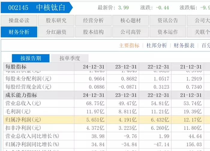 中核钛白2024年营收68.75亿元,同比增长38.98%;归母净利润5.651亿元,同比增长34.84%。2023年两项数据均为负增长,2024年业绩增长明显。和中核国际类似,中核钛白在2024年毛利率和净利率也略有下滑,毛利率由2023年的17.81%下滑至17.41%,下滑了0.4个百分点;净利率由8.48%下滑至8.22%,下滑了0.26个百分点。和中核国际大幅下滑不同,中核钛白的毛利率和净利率下滑幅度相对较小。