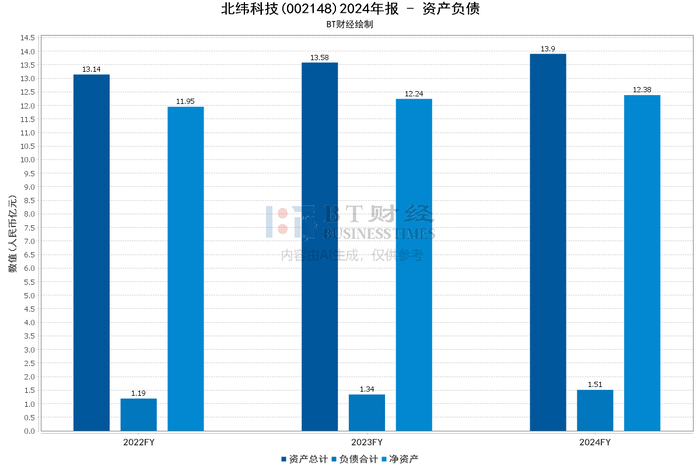 2024年,北纬科技的总资产达到了13.9亿元,同比增长2.34%。归属于上市公司股东的净资产为12.27亿元,同比增长0.76%。资产负债率从上年的9.84%上升至10.89%,显示出公司在扩展业务的同时,保持了较为稳健的资产负债管理。值得注意的是,公司的货币资金从年初的1.14亿元下降至48.04百万元,占总资产的比例也有所减少。