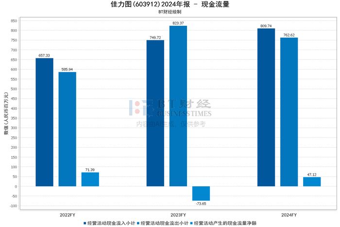 现金流方面,佳力图在2024年实现了经营活动产生的现金流量净额为4711.98万元,同比大幅改善163.97%。这一改善主要得益于公司加大采购票据结算。然而,投资活动产生的现金流量净额为-4.63亿元,显示出公司在扩展业务和投资方面的持续投入。