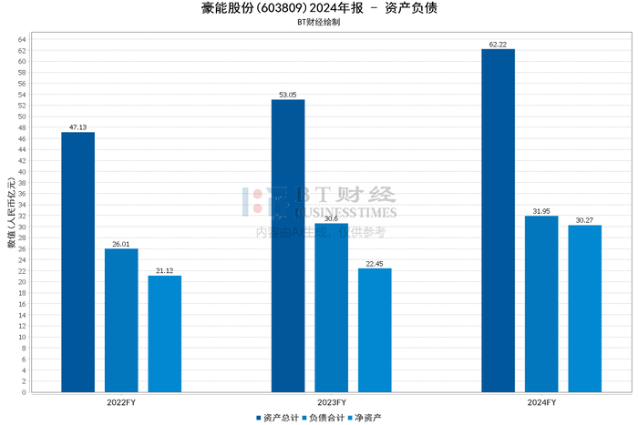 在资产负债方面,豪能股份2024年末总资产为62.22亿元,同比增长17.29%。总负债为31.95亿元,较上年末增长4.43%。资产负债率由2023年的57.68%下降至2024年的51.35%,显示出公司在扩张的同时保持了较好的财务稳健性。净资产大幅增长34.70%至30.24亿元,反映出公司通过“豪能转债”提前赎回和转股等方式有效提升了股东权益。