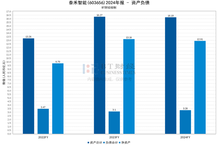 2024年末,泰禾智能的总资产为16.19亿元,同比减少0.48%。归属于上市公司股东的净资产为12.89亿元,同比减少1.74%。负债总额为3.28亿元,同比增长5.71%。资产负债率略有上升,从2023年的19.07%上升至2024年的20.26%。这些数据表明,尽管公司在资产管理上面临一定挑战,但整体财务结构仍保持相对稳定。