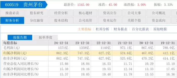 贵州茅台最新财报显示,2024年,贵州茅台营收1571亿元,同比增长15.66%,虽然相比此前两年16.53%和18.04%的增幅略有下滑,但结合近6年的平均增幅来看,也符合市场预期。2024年贵州茅台归母净利润862.3亿元,同比增长15.37%,同样比2022年和2023年19.48%和19.05%的增幅有明显下滑。但净利润连续多年保持两位数增长,超额完成年初目标。