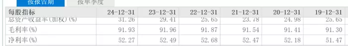 贵州茅台一直以高毛利著称,2024年贵州茅台毛利率高达91.93%,略低于2023年的91.96%,虽然创下贵州茅台第二高的毛利率,却相比2023年下滑了0.03个百分点。同期贵州茅台净利率为52.27%,为2021年以来新低,2023年贵州茅台净利率为52.49%,2024年贵州茅台净利率下滑了0.22个百分点,下滑幅度远高于毛利率的下滑幅度。