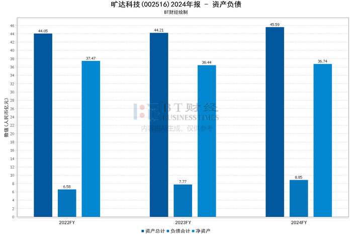 2024年,旷达科技的总资产为45.59亿元,同比增长3.10%。归属于上市公司股东的净资产为36.72亿元,同比增长0.90%。资产负债率从2023年的17.58%上升至2024年的19.41%,显示出公司在负债方面的压力有所增加。