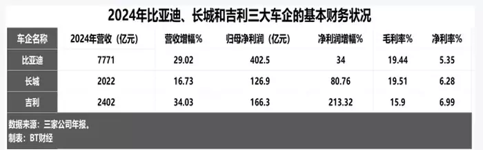 比亚迪2024年营收7771亿元,相比2023年的5023亿元,增长了29.02%。归母净利润420.5亿元,同比2023年的252.4亿元大幅增长了34%。吉利2024年营收2402亿元,同比2023年的1792亿元增长34.03%,归母净利润166.3亿元,同比2023年的53.08亿元大幅提升213.32%。长城汽车2024年营收2022亿元,同比增长16.73%;归母净利润126.9亿元,同比增幅达80.76%。