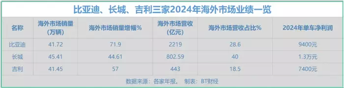吉利财报没有披露其海外市场营收情况,但吉利汽车的单车平均收入为10.7万元,而海外销量为41.45万辆,同比增长57%,占全球总销量19.06%。这样计算的话,海外营收大约在443亿元左右。海外市场营收占比为18.5%左右。其中吉利品牌出口38.15万辆,同比增长53%,覆盖中东、亚太、非洲、拉美及欧洲等81个市场。领克品牌进入全球39个市场,极氪布局超40个国家和地区,高端车型(如中国星系列)占比提升。