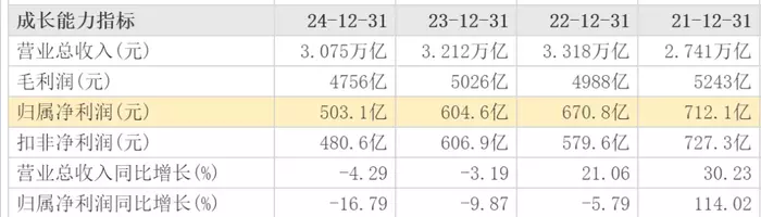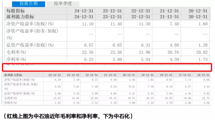 同期中石化的净利润却出现三连跌。近三年净利润分别下跌5.79%、9.87%和16.79%,净利润也由2021年的712.1亿元跌至2024年的503.1亿元,四年净利润下跌了209亿元。在盈利能力上,中石化和中石油有不小差距,2024年中石油的净利润是中石化的3.3倍,两者相差1144亿元。