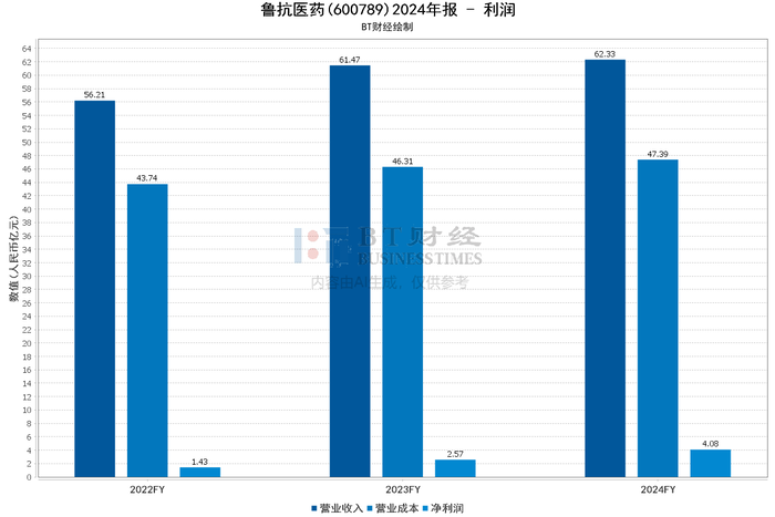 在利润方面,鲁抗医药2024年的营业收入为62.33亿元,同比增长1.41%。归属于上市公司股东的净利润为3.95亿元,同比增长60.30%,这主要得益于非经常性损益的增加和主营业务收入的增长。营业成本同比增长2.34%至47.39亿元,毛利率略微下降至23.96%。