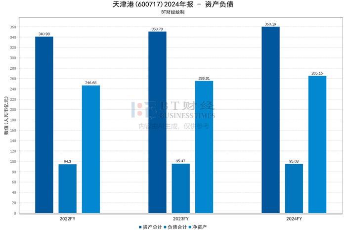 2024年末,天津港的总资产为360.19亿元,同比增长2.68%。资产负债率从上年的27.22%下降至26.39%,显示出公司在控制负债方面的有效性。负债总额略有减少,期末为95.03亿元,表明公司在债务管理上保持了稳健的策略。