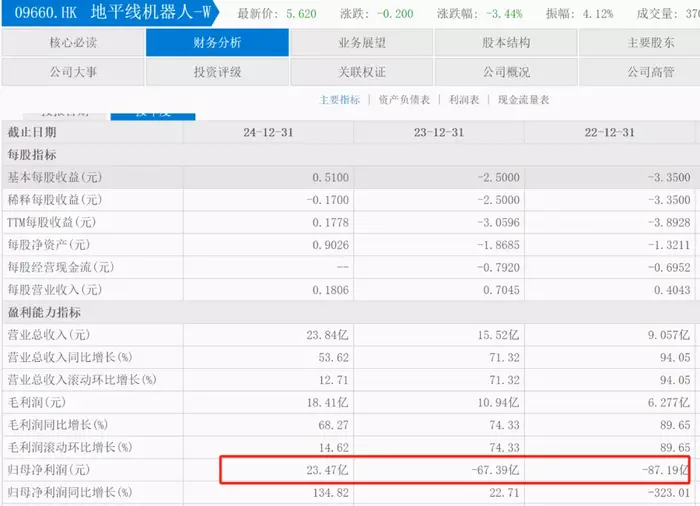 地平线在2024年业绩表现优异。全年营收23.84亿元,同比增长53.62%,营收由2022年的9.05亿元,提升了14.8亿元。在这一年地平线扭亏为盈,由2023年净亏损67.39亿元,提升至盈利23.47亿元。归母净利润同比增长134.82%。
