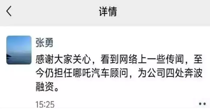 张勇在朋友圈回应称:“自己至今仍担任哪吒汽车顾问,为公司四处奔走筹措资金。”2024年12月6日,哪吒汽车官宣张勇因“战略调整”不再担任公司CEO,转任公司顾问,创始人方运舟兼任CEO。一个顾问能为融资而奔走海外,CEO却没有公开露面,这让众多哪吒车主心存疑惑。