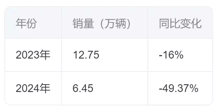 2023年起哪吒汽车销量开始大幅下滑,2023年累计销量12.75万辆,同比下滑16%,成为当年唯一销量“开倒车”的头部新势力车企。2024年销量暴跌至6.45万辆,同比2023年下跌了49.37%,销量腰斩。尤其是2024年下半年,销量断崖式下跌,10月销量还有6290辆,到了12月就只有237辆,2025年1月更是跌至110辆。