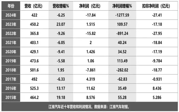 如上表所示,江淮汽车十年间多次出现营收下滑的情况,2024年422亿元的营收甚至比十年前464.2亿元的营收少了42.2亿元。十年前的净利润为8.676亿元,十年后则亏损17.84亿元。