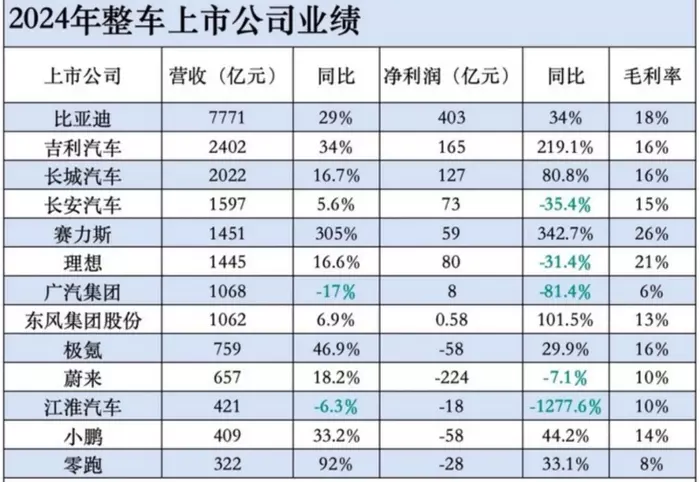 近期国内上市车企几乎都发布了2024年年报,在已经发布年报的车企中,江淮汽车或较为尴尬,他是众多车企中唯一一家由盈转亏的整车车企。2024年国内汽车行业整体利润规模在1000亿左右,比亚迪、吉利、长城是最赚钱的三家公司,净利润分别为403亿元、165亿元和127亿元,三家合计总利润近700亿元,利润占行业总利润七成。