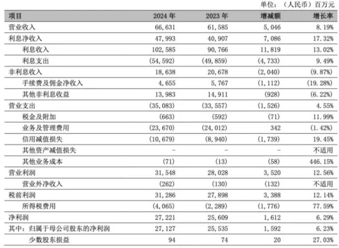 已经发布2024年年报的上市商业银行,呈现“国有大行稳、中小银行快”的差异化格局。2024年宁波银行营收666.3亿元,同比增长8.19%;净利润273亿元,同比增长6.23%。综合整个市场来看,宁波银行8.19%的增幅,在业内尤为醒目。